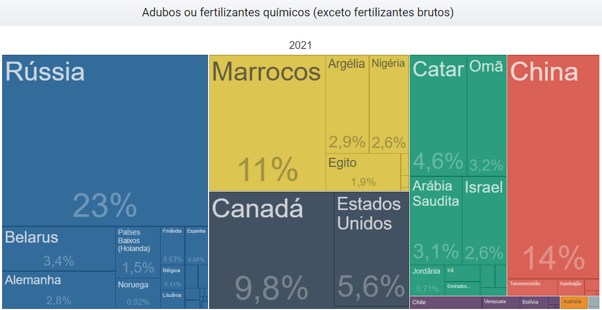Atualmente, os 6 maiores exportadores de fertilizantes são: Rússia, China, Canadá, Marrocos, Estados Unidos da América e Arábia Saudita. Coletivamente, esses principais fornecedores responderam por mais da metade (52,6%) dos fertilizantes exportados globalmente em 2021.