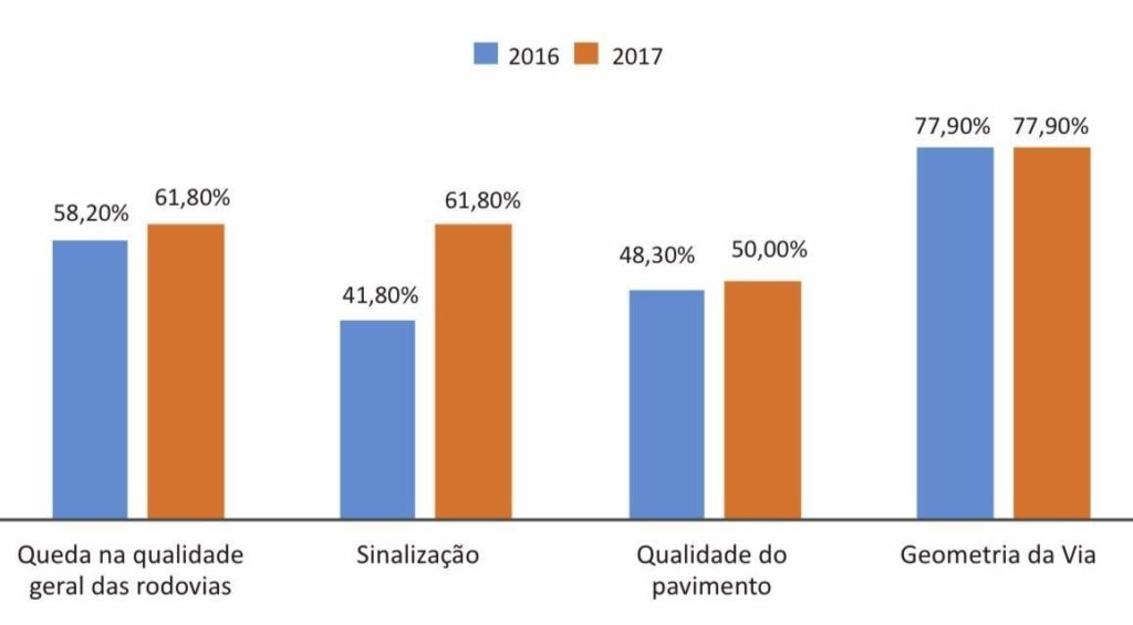 Uma pesquisa sobre a qualidade das rodovias brasileiras em 105.814km de rodovias pavimentadas nos anos de 2016 e 2017 mostrou uma queda na qualidade geral das rodovias.