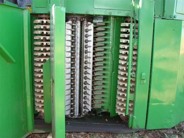 As colhedoras do tipo picker tem por característica retirar apenas o algodão em caroço dos capulhos abertos, sem puxar as casquinhas, para isso há o auxílio dos fusos em rotação. Em seguida ele é desprendido dos fusos com desfibradores de borracha, conhecidos como doffer (como visto na imagem abaixo), e levado para o cesto armazenador da máquina por correntes de ar.