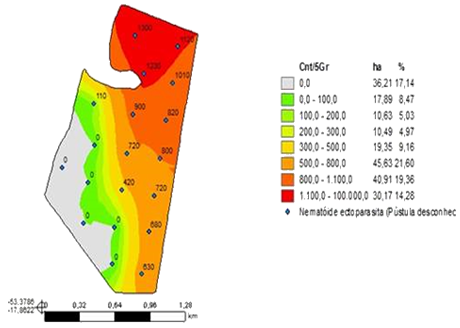 Sabemos que as manchas de solo provocadas por nematóides coincidem com as manchas encontradas nos índices de vegetação (veja nosso estudo de caso), e dessa forma conseguimos identificar não só onde se encontram as reboleiras como também a extensão do seu dano, o que não é identificado precisamente a olho nú. Uma vez que sabemos a extensão da mancha, e quais áreas devemos ter mais atenção, pode-se montar um grid customizado, mais preciso e mais barato que a utilização de um grid padrão, já que áreas acusadas pelos índices serão tratadas separadamente e é possível ter uma redução do número de amostras em áreas com boas respostas.