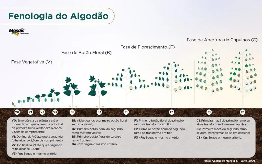 O algodão tem seu ciclo dividido em 4 estádios fenológicos totais, sendo que em cada um, há divisões nos períodos evolutivos da planta : Estádio Vegetativo, Estádio de Botões Florais, Estádio de Florescimento e Abertura dos Capulhos.
