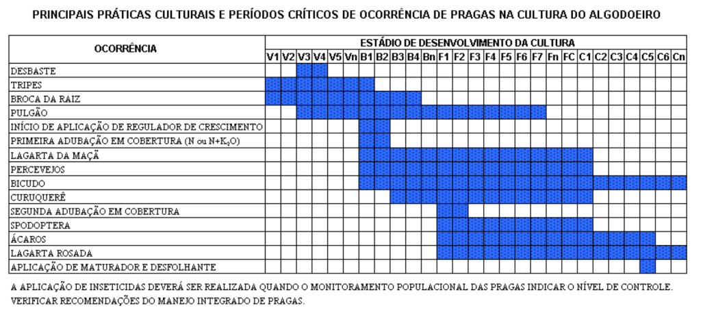 Agora que você já sabe como determinar o estádio fenológico da planta de algodão, seguem algumas das principais práticas de manejo do algodoeiro e em que fases são mais comuns a incidências de pragas, doenças e insumos fisiológicos e nutricionais.