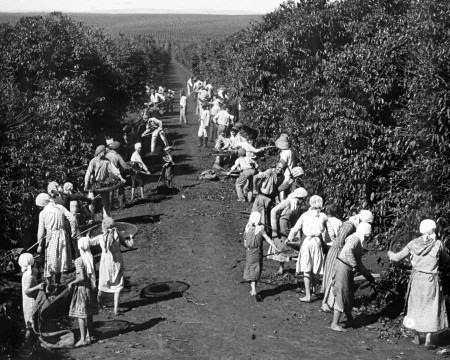 Fotografia de trabalhadores fazendo colheita de café na lavoura – Fonte: