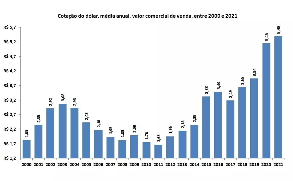 Após diversos aumentos consecutivos registrados ao longo do ano passado e no início de 2022 (em março de 2021 chegou a R$ 5,53), o dólar tem caído nos últimos dias, chegando a operar abaixo dos R$ 5 (despencou, inclusive, para R$ 4,74 nos últimos dias de março de 2022). A queda é impulsionada, sobretudo, pelo conflito entre Rússia e Ucrânia, que provocou uma instabilidade no mercado internacional, com alta das commodities, especialmente o petróleo e matérias-primas agrícolas, como a soja e o milho.