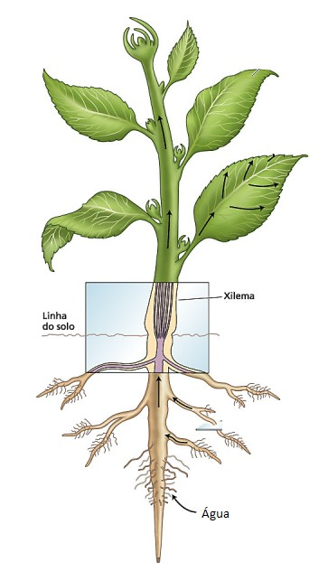 E como a planta absorve a água? Pelas raízes que captam o líquido no solo e levam os nutrientes para toda a planta. O processo de distribuição dos nutrientes é feito por um vaso condutor chamado xilema. Ou seja, ele é responsável por distribuir a seiva bruta das raízes para os caules e folhas.