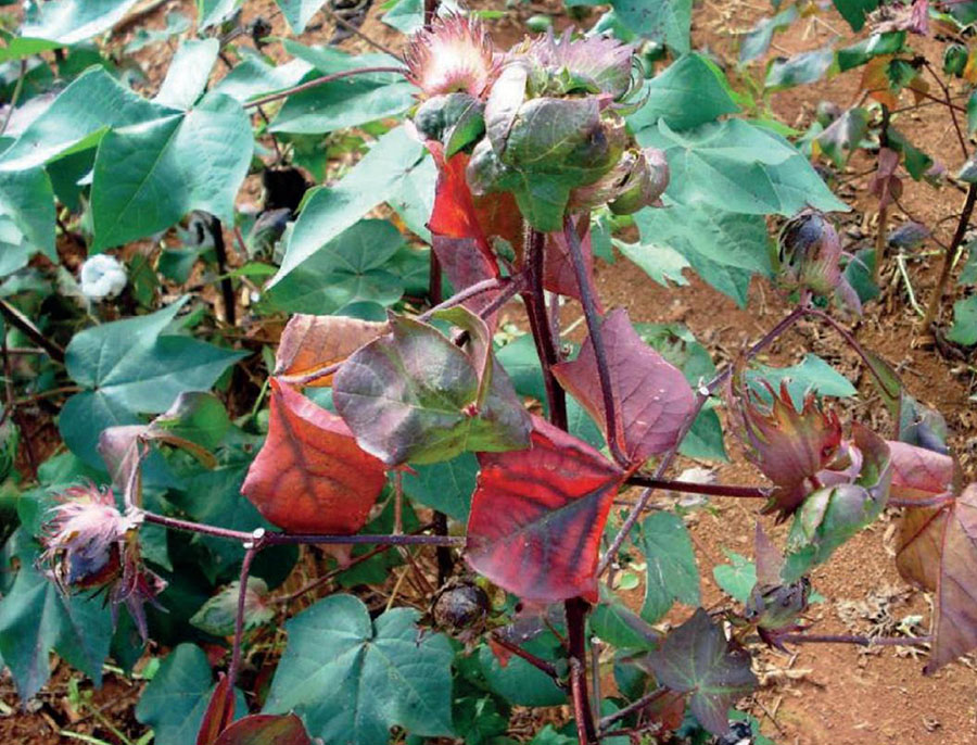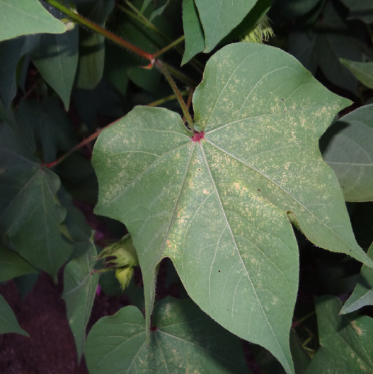 As folhas ficam escurecidas na face superior e com aspecto brilhante na face inferior, com pequenas ondulações, evoluindo para um aspecto coriáceo e com o bordo virado para baixo. Com o avanço do ataque, rasgaduras começam a surgir nas folhas, como é conhecido “ácaro-da-rasgadura-do-algodoeiro”.