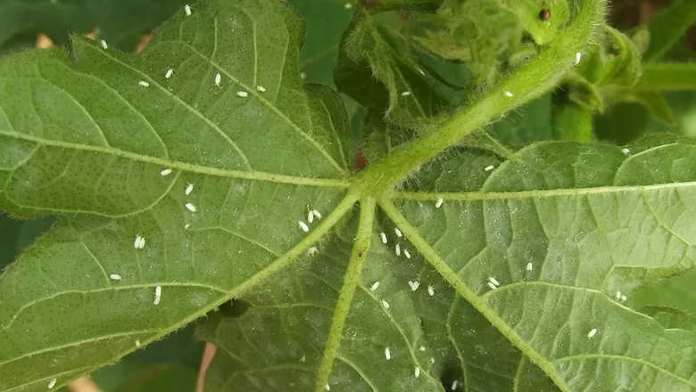 A mosca branca também é um inseto vetor de doenças como o vírus do mosaico comum no algodão que causa engrossamento das nervuras, mosaico foliar, redução da área foliar e queda de folhas e frutos.