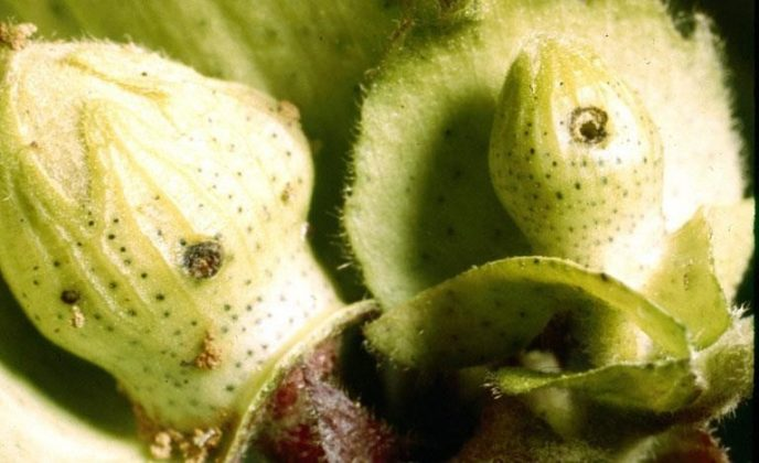 Os botões florais atacados caem e as maçãs são total ou parcialmente destruídas, assim como as fibras e as sementes. As flores não abrem e ficam conhecidas como flores rosetadas. Os capulhos amadurecem precocemente, deixando a fibra com aspecto de ferrugem.