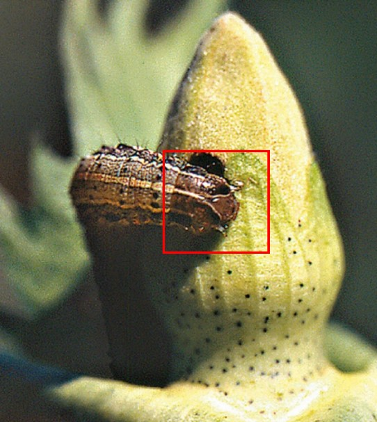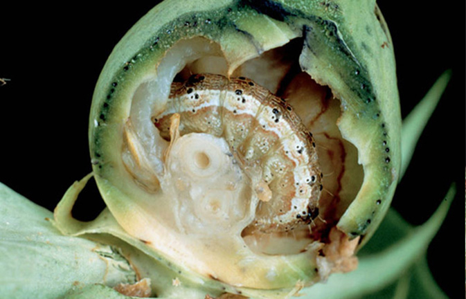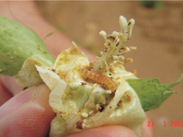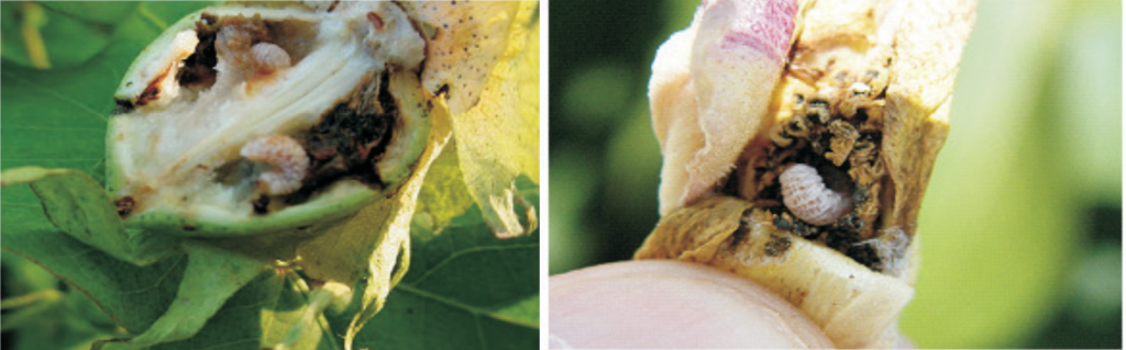 Assim os botões florais e as maçãs são danificadas e com galerias que servem como porta de entrada para patógenos. Também a queda dos botões e das maças e a destruição das fibras e sementes.