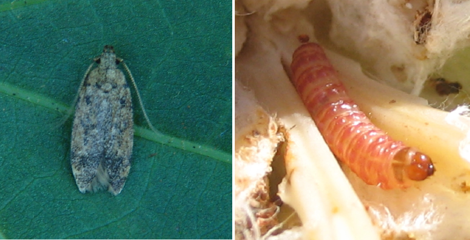 O adulto é um microlepidóptero de 20 mm de comprimento de cor parda e asa anterior com manchas escuras e asa posterior cinza-escura. Os ovos são colocados entre as fendas das brácteas, flores e maçãs. A lagarta varia de 10 a 14 mm de comprimento com coloração branco leitosa quando pequena passando para rosado quando maior. Elas vivem no interior dos botões, flores e maçãs.