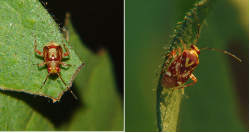 Os adultos e as ninfas do percevejo-rajado são muito semelhantes, sendo que as ninfas apresenta um “Y” invertido sobre o abdome e os adultos um “V” característico de coloração amarela.