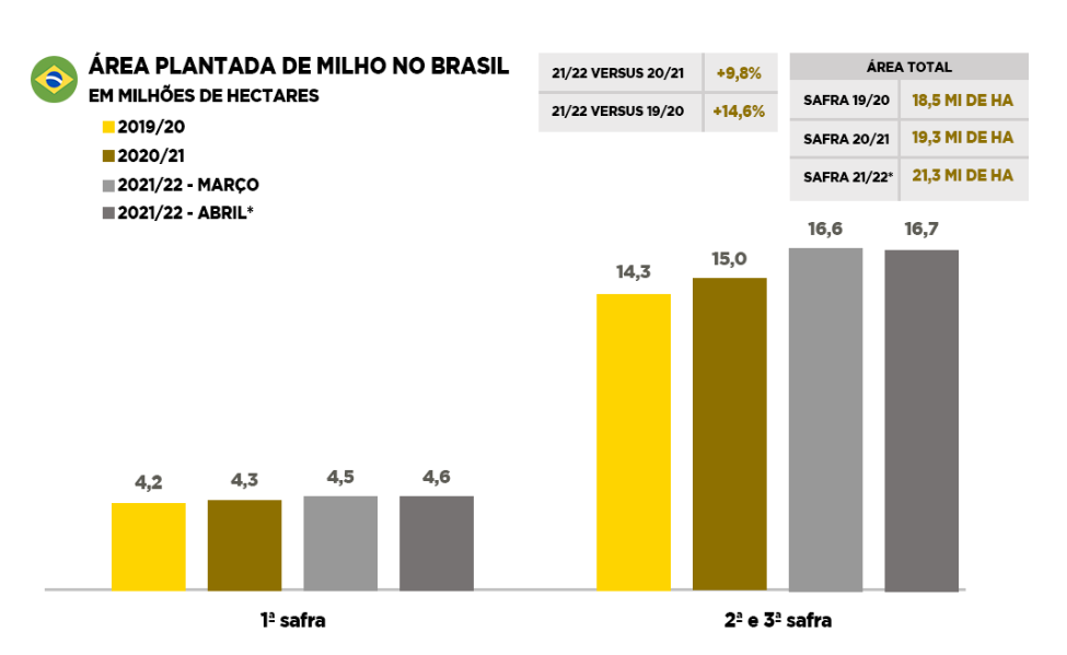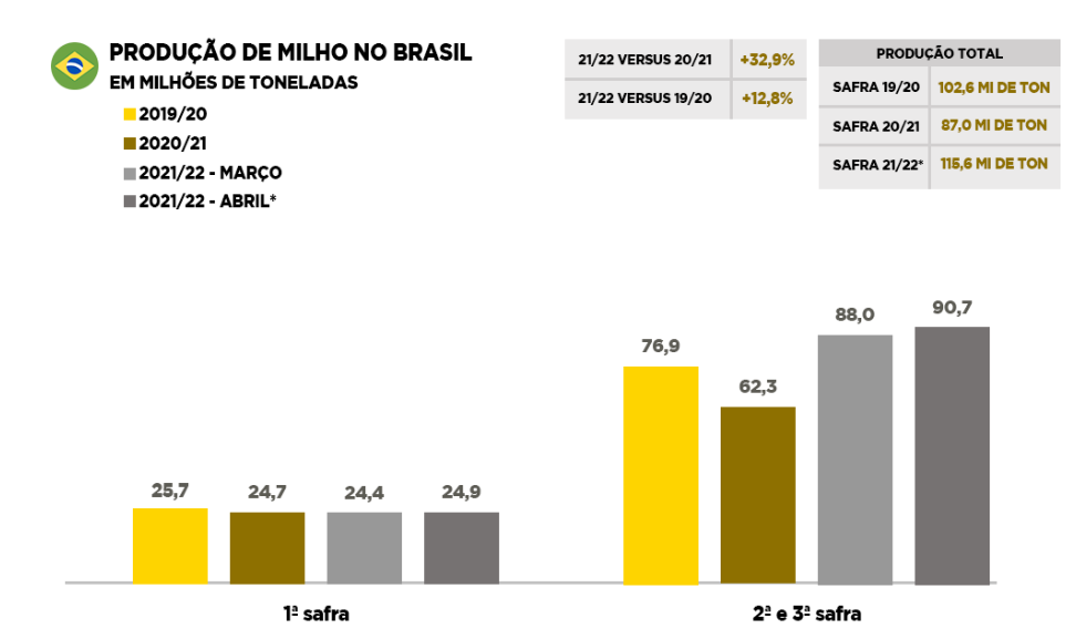 Em 2020, o Brasil produziu cerca de 6% de todo milho consumido no mundo todo, se tornando o terceiro maior produtor do grão. A posição se manteve em 2021 e a expectativa é que o crescimento se mantenha em 2022.