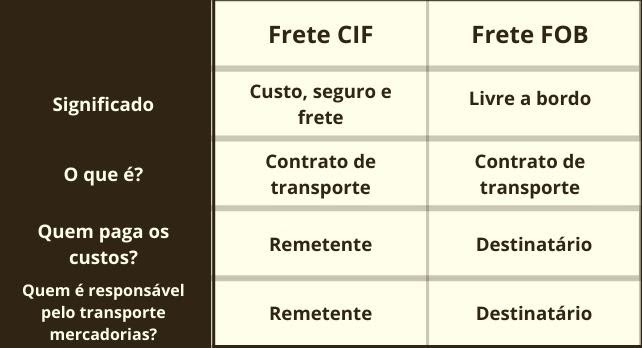 Há basicamente dois conceitos, que se diferenciam, entre outras coisas, pelo momento em que o pagamento será feito: CIF (Cost, Insurance and Freight) e FOB (Free on Board).