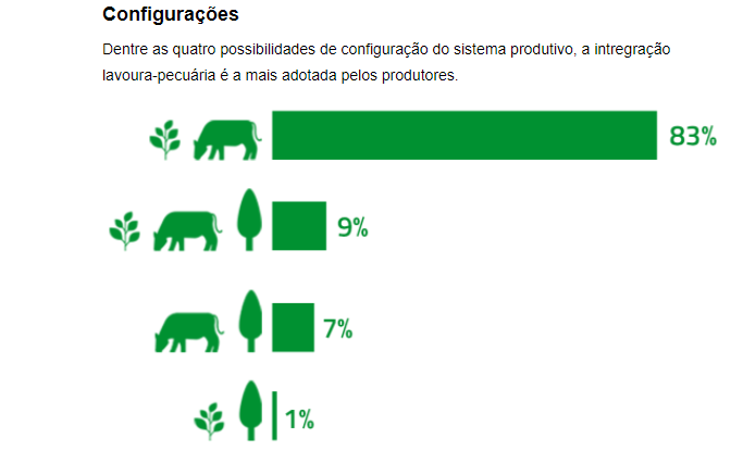 Dentre os quatro sistemas existentes, o mais utilizado pelos produtores é a integração lavoura-pecuária (ILP) com 83%, seguido pela integração lavoura-pecuária-floresta com 9%, integração pecuária-floresta com 7% e integração lavoura-floresta com 1%.