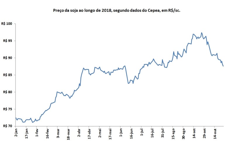 Preço da soja ao longo de 2018. Fonte: Cepea.